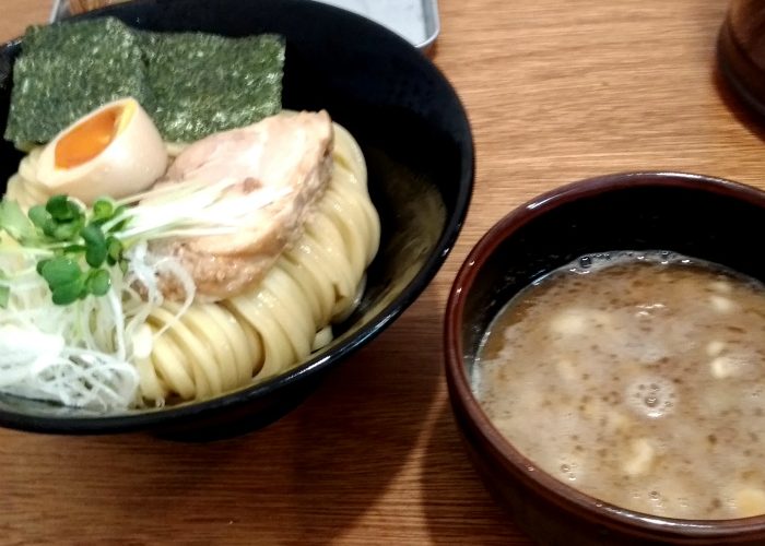 濃厚つけ麺は、豚骨とアゴ出汁のブレンドで、やや魚寄りのバランスながら癖がなく後味スッキリ。自家製の極太ストレート麺のモチっとした歯ごたえ、伸び、コシもお見事。