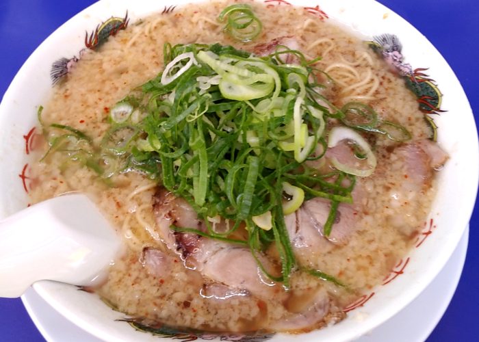スープはあっさりした鶏ガラ醤油で、表面には背脂がたっぷり。麺は柔らかめの細麺、多めで薄切りの肩ロースチャーシュー、たっぷりの青ネギと、今では少数派になりつつある典型的な京都ラーメンスタイルです。