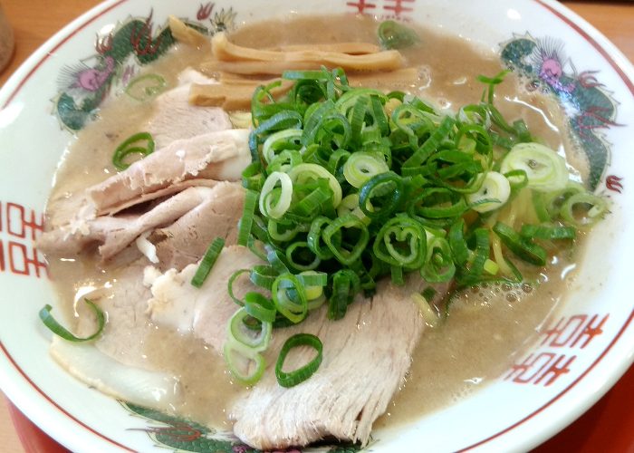 出て来たラーメンは、赤い中華文様の鉢に、もも肉薄切りのチャーシュー、メンマ、青ネギと見た目は天下一品にそっくりです。