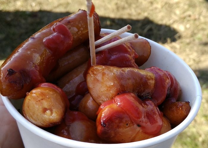 いつも買ってる、タケダハムの屋台。カップにソーセージがてんこ盛りで200円という安さ!