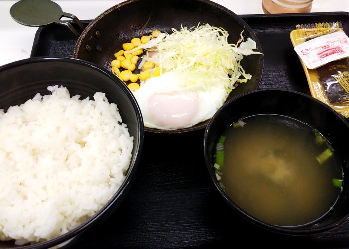 ハムエッグ自体は、鉄板の予熱で自分の好みに黄身の火の通し具合を調節出来るのが嬉しいですな。ただ、ご飯は牛丼に最適化されているので、朝飯として食べるにはパサパサし過ぎてます。卵かけならパサパサ感は多少緩和できたかもしれませんが、ハムエッグじゃ逃げ道無いですな。