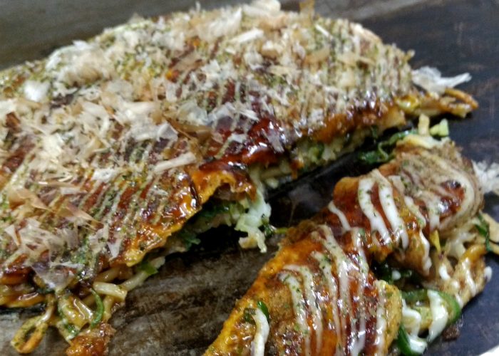 一見すると何の変哲も無いお好み焼きなのですが、中にそばが入っていて、生地もそばも薄っぺらく伸ばされた状態で焼き上げられているのですよ。