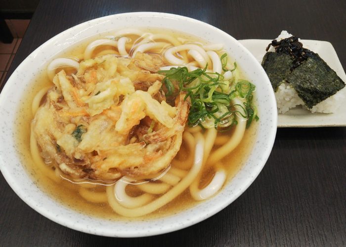 これは都そば本町店で食べた、かき揚げうどん。食欲はそこそこあったのでおにぎりも付けました。