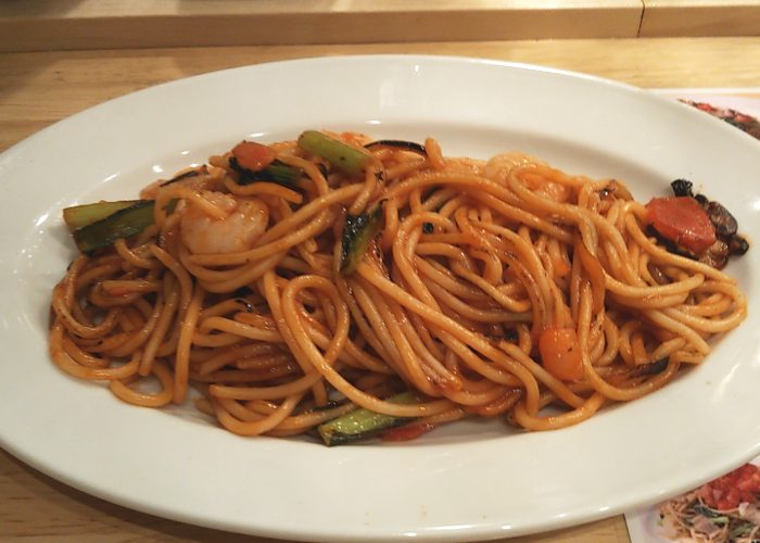 ナポリタンは、意外にもケチャップは控えめであっさり味。トマト、エビ、小松菜、椎茸とどこか和風な雰囲気が感じられます。麺は期待したほど太くなく、コシもいまいち。ちょっと焦げてますな。