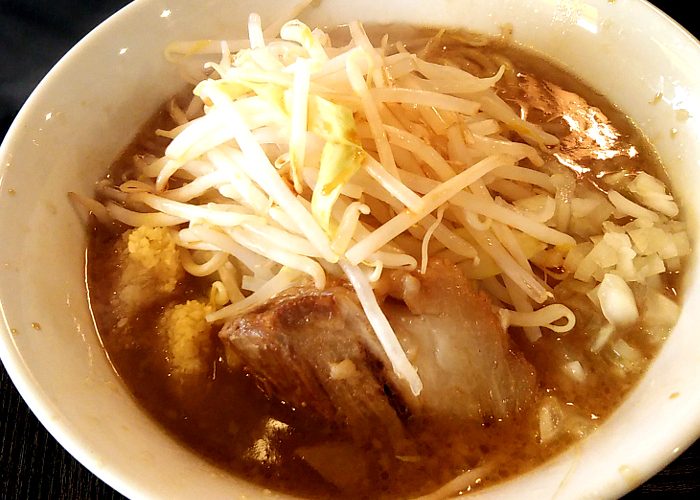 野菜はほぼもやしでシャキシャキとした茹で上がり。そして刻みタマネギ。豚はホロホロと柔らかいけど、サイズ小さめのウデ肉が1つとちょっと寂しいのも変わらず(笑)。