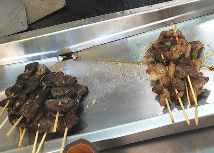 メニューは1本50円のホルモンに、100円でアバラ、レバー、シンゾウ、野菜類、200円でミノとありますが、GWで市場が閉まっているためこの日はホルモンとアブラだけしかありませんでした。