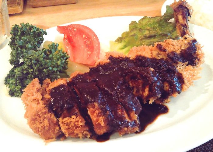 そのチキンカツは、骨付きモモ肉を1本揚げた豪快な一品で、カリッと揚がった衣と、ジューシーな鶏肉がたまりません。付け合せは、ブロッコリーの温野菜、ポテサラ、サニーレタス、パセリ。