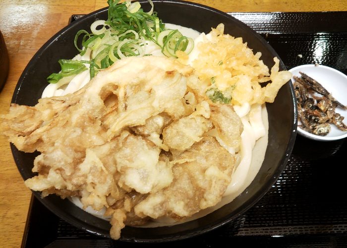 レジ横でうどんと通し揚げの天ぷらを受け取ると、奥のカウンターでネギ、天カス、そして名物のいりこの素揚げをトッピングします。