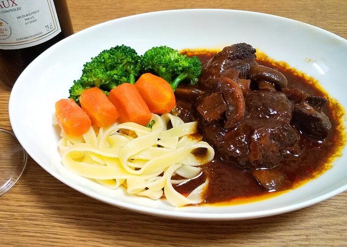 その後、肉を取り出して煮汁を越し、煮汁に肉、バターで炒めたマッシュルーム、ブラウンルー、マデイラ酒を加えて1時間ほどコトコト。