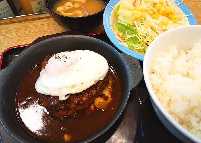 ノーマルの定食が790円で、最も高いチーズエッグハンバーグが950円ですが、チーズはパスして850円のエッグハンバーグ定食をご飯大盛りでオーダー。