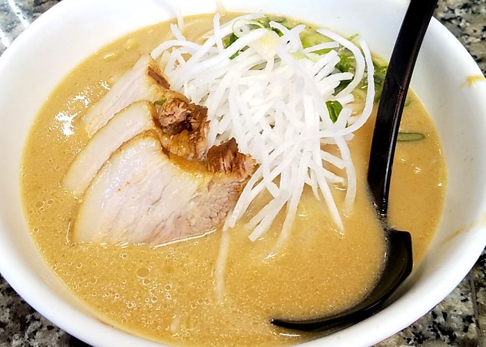 ノーマルのラーメンでも、1cmぐらいの厚みがあるプルプルのバラ肉チャーシューが3枚乗っかり食べごたえ満点です。あとは大根の千切りとネギ。