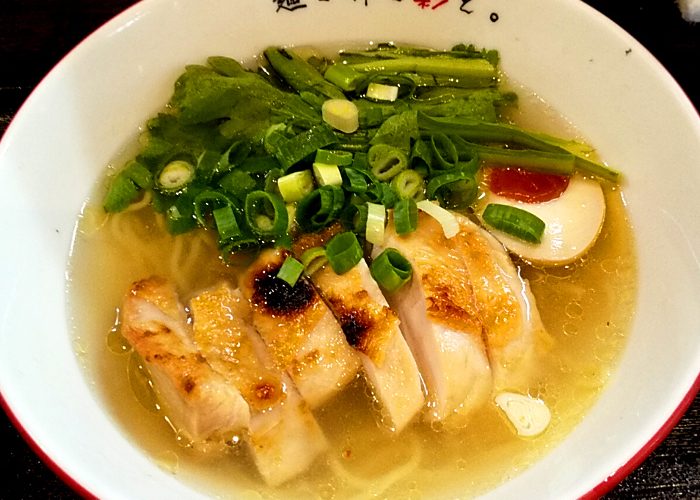 加水率高めのツルツルした中細麺、鶏ガラ、丸鶏の旨味に日本酒の風味が感じられるふくよかなスープに塩ダレと、シンプルな構成ながら単調さをあまり感じないのはさすが。