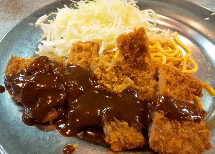 付け合せは質素なキャベツの千切りとスパゲティ、銀色のアルミ皿が醸し出すチープな雰囲気もたまりませんなあ。