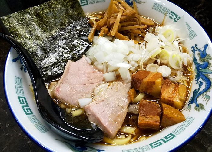 スープを飲んでみると、ガツンとビターな煮干しと豚骨のブレンドスープで、これは明らかに家系とは違います。そして生玉ねぎ、海苔、平打ち麺と来たら、もしかすると「燕三条系」なのでは?