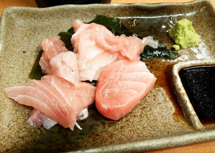 まずは店の看板メニューであるマグロ頬肉の刺し身(400円)。やや筋っぽいですが、脂の乗りは抜群です!
