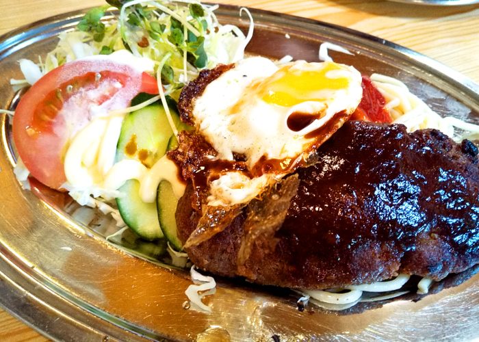 ハンバーグの上には目玉焼き、下にはケチャップがかかった大量のスパゲティが敷かれています。野菜が高いのに、トマト、きゅうり、キャベツがしっかり盛られているのが良心的ですな。ご飯も少なめで普通の1人前以上の量があります。