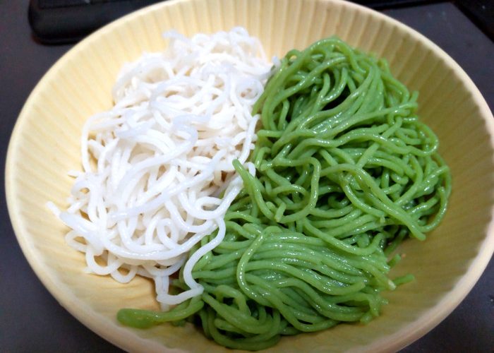 白身魚のすり身を型に入れて細くひねり出したもので、添付の冷たい出汁をかけていただきます。