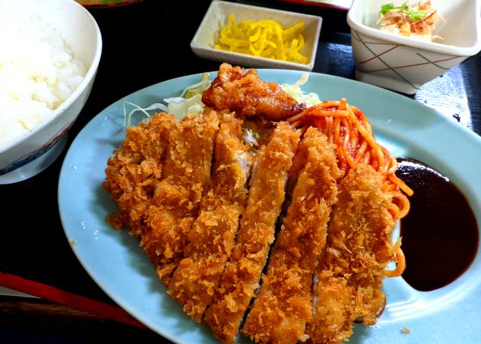 もちろん手作りで肉質も「松のや」や「かつや」より良いぐらい。ケチャップスパ、キャベツの千切り、冷奴、漬物、伝統のそうめんが入った味噌汁、たっぷりのご飯がついて、これで500円だったら十分すぎる値打ちですな!