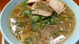 チャーシューは豚の肩ロースをレアに仕上げた薄切り。肉質良好、量はたっぷりあって物足りなさは無し。あとは和海のアイデンティティである車麩と香りの良い海苔、青ネギという構成。