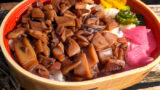 弁当箱は風呂敷状の紙布で結んであって、相変わらずキャッチーな包装ですな。かつては経木の箱にすだれの蓋がされてる手の混みようでしたが、今はすだれをプリントした紙箱になってしまったのが残念です。