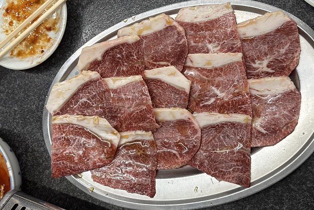 メニューは、焼肉とホルモン、キムチ、ナムル類ぐらいで、冷麺やクッパのようなサイドメニューが無くて極めてシンプル。最も高いのが黒毛和牛のカルビ1200円で、塩タンが何と3桁の900円と今どきあり得ない値付けでビックリ。