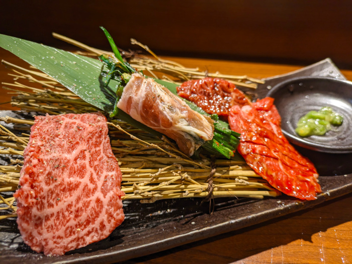 この日のごぶ盛りは、和牛のミスジとトウガラシ、ハラミ、ネギを塩タンで巻いたもの。見た目は霜降りでゴージャスですが、食べてみると意外と肉味が弱い感じ。