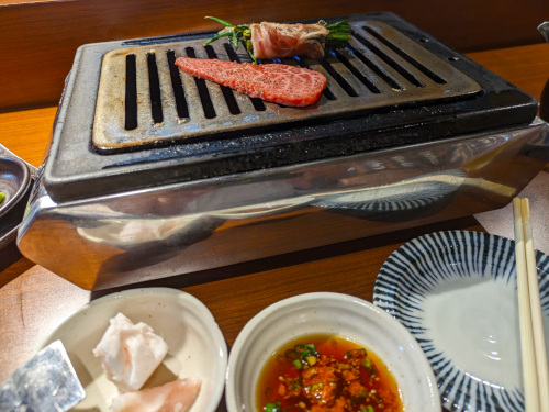 焼き台はガス火のロースターで、肉が焦げないように牛脂が添えられているのがユニーク。つけダレは酸味のあるあっさりタイプで、卓上には辛子味噌が置かれています。