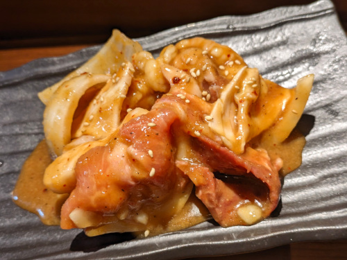 ホルモンMix(800円)は、タケノコ(動脈)、カシラ、ハツ、アゴ、テッチャン、小腸、玉ねぎが味噌ダレで和えられています。小腸が新鮮でプリプリでしたが、あとはまあ並かな。