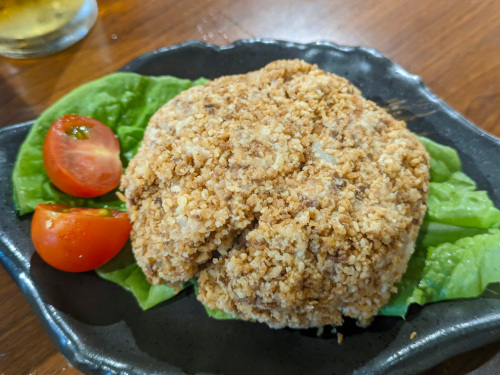 「まるでコロッケみたいなポテサラ」は、潰したじゃがいもに砕いたナッツがまぶされたもので、妙に甘いしボソボソで食べにくかったです。