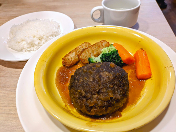 ハンバーグを食べてみると、ややオイリーだけどしっとりと肉汁を湛えた粗挽き牛肉の旨味が感じられて、ファミレスレベルを超えたクォリティ。