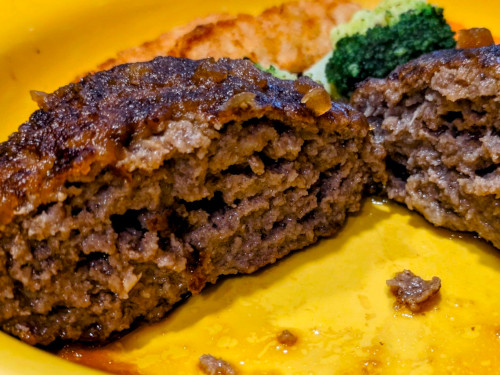 厚みが4cmはある分厚いハンバーグは、カットしてみると中までしっかりと火が通っており、今流行りの肉汁ドバ系でもないオーソドックスなタイプ。