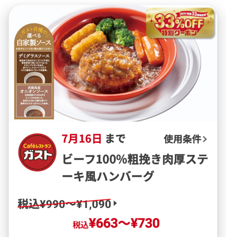 今回使用したのは、ガストの「ビーフ100%粗挽き肉厚ステーキ風ハンバーグ」が33%引きになるクーポン。