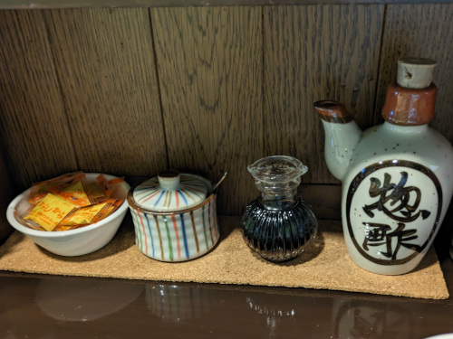 カウンター上には、塩、醤油、とんかつソース、ドレッシング、辛子の小袋が完備。