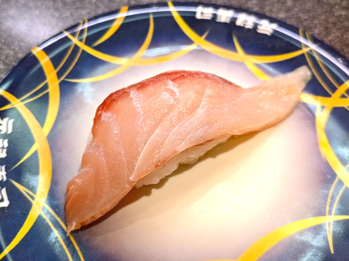 まずは季節メニューから「近大生まれのブリヒラ」。近畿大学水産研究所が開発したブリとヒラマサのハイブリッドだそうで、脂乗りとコリコリとした歯ごたえが両立した寿司ネタ。