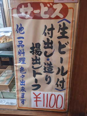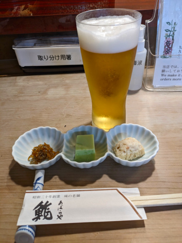 まずは生ビールと、鶏団子、枝豆豆腐、じやこ山椒が入った突き出し。内容は季節によって変わるみたいですな。