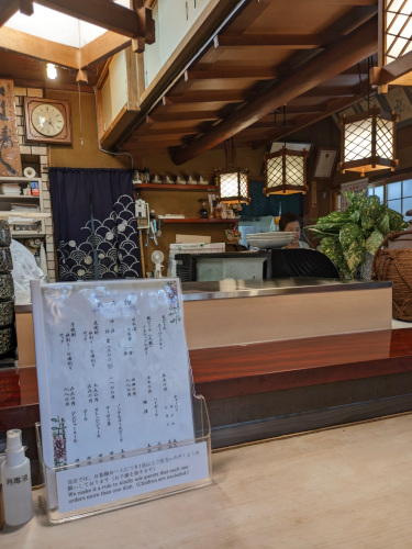 予約していた鯖寿司を受け取って帰るつもりでしたが、ちょっと小腹が空いていたので店頭に張り紙されていた1100円のサービスセットをいただくことに。