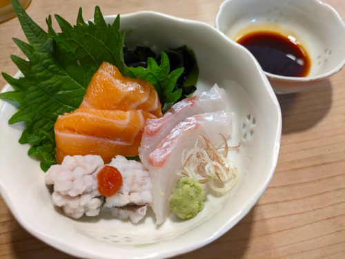 刺し身はサーモン、鯛、鱧の湯引きで、これも季節感があって良い感じ。もちろん到底ビール1杯じゃ足りなくてお酒の温燗を追加。