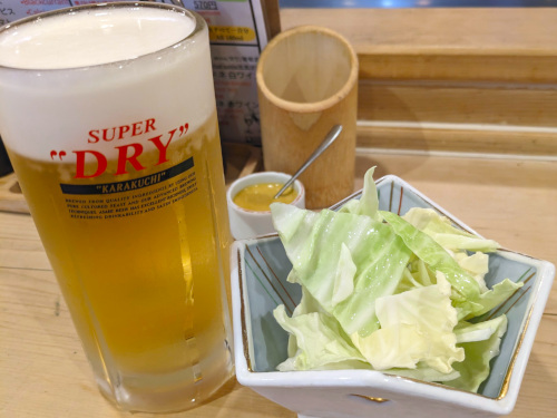 まずはハッピーアワーで330円の中ビールと、お通しのキャベツ。