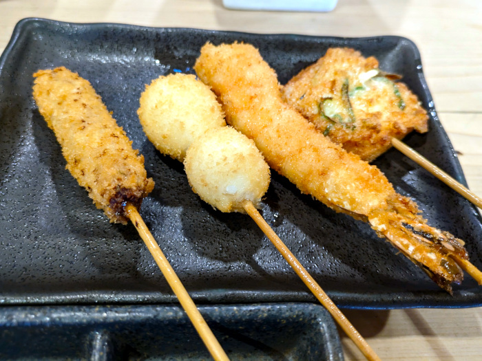 串カツは、オランダという鶏ささみのミンチに、うずら卵、エビ、エビパンと先に4本。