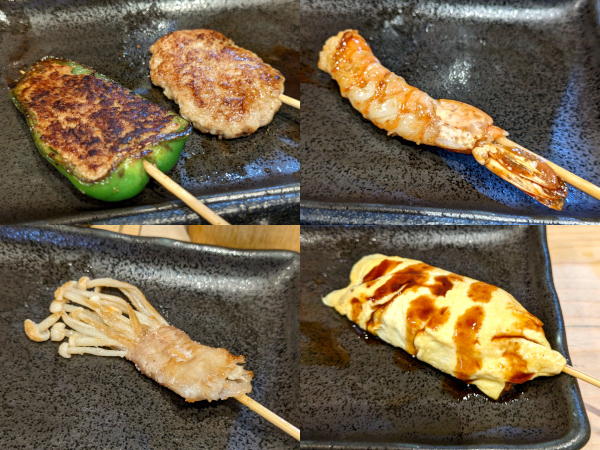 くわ焼きは、ピーマンの肉詰めにかしわハンバーグ、エビ、えのき、豚平焼きの5本。