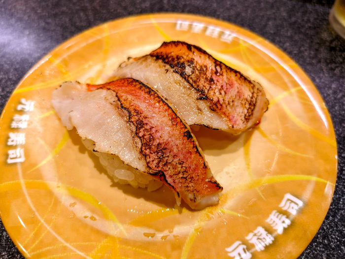 期間限定メニュー、キンメダイの炙り。バーナーで炙られたところでほんのり温かく、脂のりはイマイチでしたが、食べると鼻に抜ける香りがたまりません。