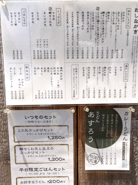 メニューは讃岐系としては標準的なラインナップ。ひやかけが気になったのですが、最初なので無難に「鯛ちくわ天温玉ぶっかけ」(1050円)の単品にしてみました。