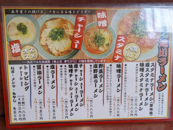 店名こそ旭川ラーメンですが、店の看板にもあるように実際はいわゆる”天理スタミナラーメン”が売りの店なんですよね。一般的にスタミナラーメンのスープは醤油味ですが、こちらには味噌があるのが珍しくて頼んでみました。