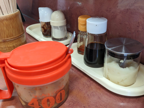 卓上にはおろしニンニク、辛子味噌、キムチの容器が置かれ、さらにジャンキーさを増量させる事が可能。