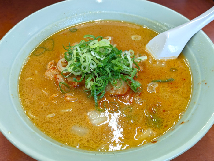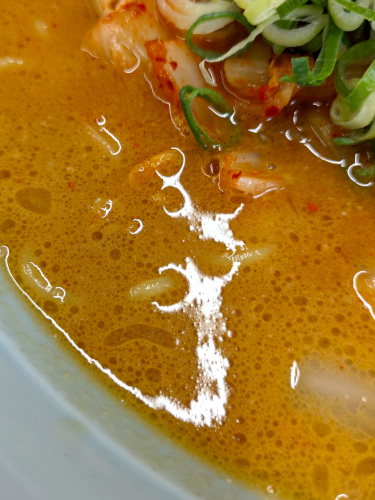 スープのベースは豚骨だそうで、若干のゼラチンを感じますがシャバっとしたライト豚骨。味噌はごくノーマルのストレートな使い方で、ニンニクと辛子味噌がガッツリ効いています。