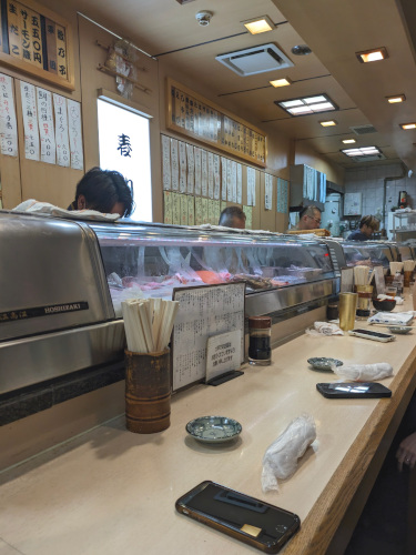 手前はカウンター席ですが、支店のほうは3階まで席があるようで、ずらりと並んだ職人さんがフル回転で寿司を握っています。