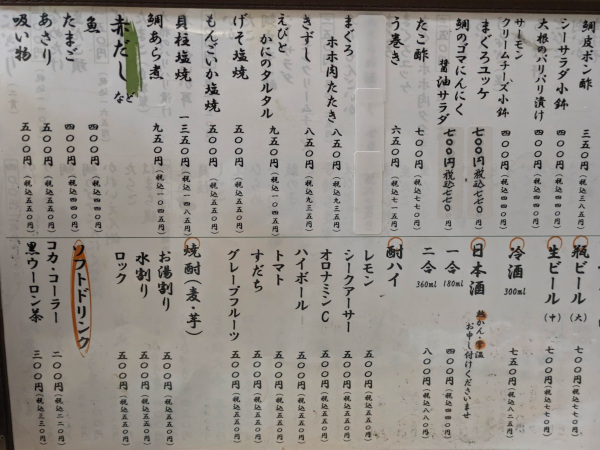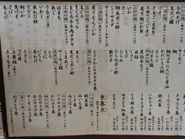 寿司は100円から、高いものでも550円までとリーズナブル。瓶ビールが700円なのも酒飲みにはありがたいですな。