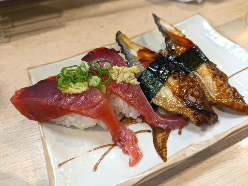 350円のうなぎとカツオの握り。うなぎは大ぶり、カツオは独特の香りが良いですな。