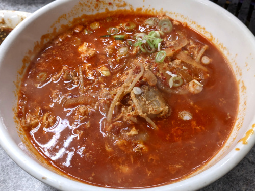 そしてこれも丼になみなみと入ったユッケジャン。中にはテール肉がゴロゴロ、野菜や卵もたっぷりで食べ応え満点です。