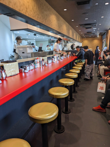 それでもカウンター席はガラガラなのに、券売機でオーダーする前にいったん中待ち席で10分ほど待たされる謎システムは相変わらずです。そしてやっぱり着席してからも結構待たされます・・・